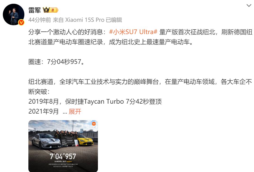 雷军称小米SU7 Ultra成为纽北史上最速量产电动车